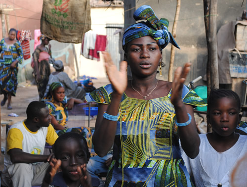 - Lamenatas kusine Salimata synger og klapper til en traditionel dogon bryllupssang. Hendes kjole er af det stof, som alle gæsterne havde på i løbet af brylluppet