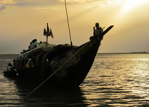 - Det er næsten mørkt, inden pinassen sejler mod nord op gennem Nigerflodens indlandsdelta