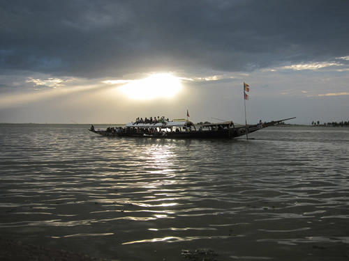 Nogle venter på deres båd. Bådene sejler omkring solnedgang til fjerntliggende landsbyen langs floden. Folk sidder ovenpå lasten og på det buede tag af stråmåtter i stillinger, som må føles uudholdelige allerede efter et kvarter. Om natten må de passe på, at de ikke falder i søvn, for der er intet mellem dem og floden. En smule overbalance, og kroppen forsvinder i det mørke vand.