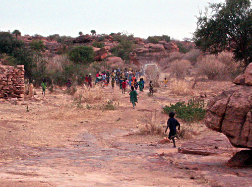 Vi kører mod nord fra Bandiagara, hovedbyen i dogonområdet midt i Mali. Der er 80 kilometers kørsel, selv om der ikke er så langt i luftlinie. Men området består af klipper og dybe klippespalter vekslende med flade vindblæste sletter med enkelte buske. Jeg skal se, hvilken indsats områdets landsbyer selv har gjort for at forbedre vejen. Og bortset fra en kort strækning, som ingen landsbyer åbenbart regner for deres nærområde, er der blevet fjernet og knust sten, fyldt huller og støbt fundament over de dybeste vandløb.