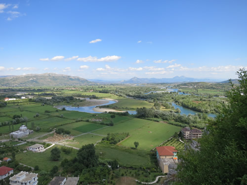 - Borgen Rozafa er ikke længere beboet. Herfra kan man følge de tre floder, som mødes ved byen og som i tidligere tider gjorde den strategisk vigtig. Hele området bliver ofte oversvømmet. Nederst til venstre en moske, der var oversvømmet ved mit første besøg i foråret 2013.