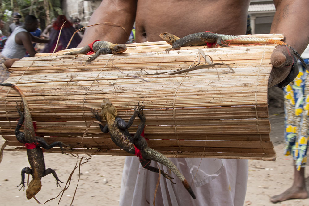 Præsten begynder ritualet med et offer til Legba i form af en kalabas-skål fyldt med den intenst orange palmeolie. Derefter er der hul igennem til den guddommelige verden og der bliver ofret en hane i templet for zangbeto. Det varme røde blod farver templets fetish glinsende rød.