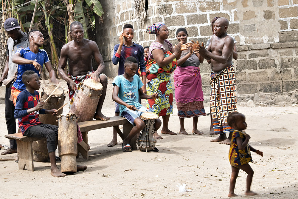 Først nu har zangbetoen fået karakter af en zangbeto. Vi følger med til landsbyens centrale plads, hvor landsbyens indbyggere møder op. Der er et orkester med trommer og et kor af kvinder. De små børn er forventningsfulde og danser til trommernes rytme.