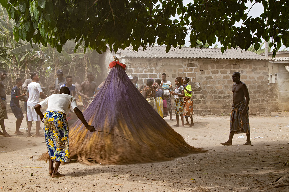 Endelig sætter zangbetoen i gang. Den snurrer om sig selv i en glidende bevægelse rundt om pladsens træ. To mænd dirigerer zangbeto med råb og svirp af en tynd pisk.
