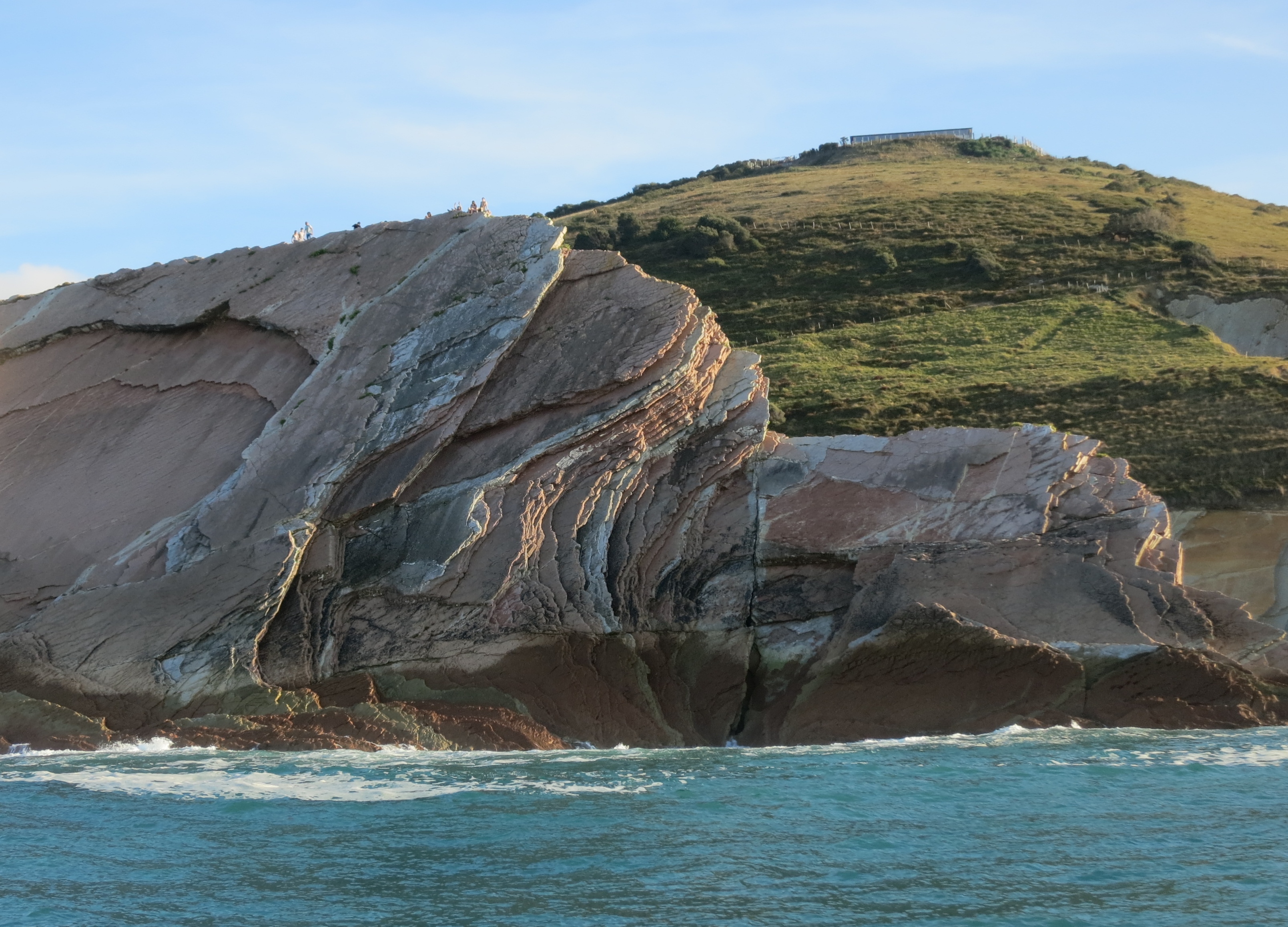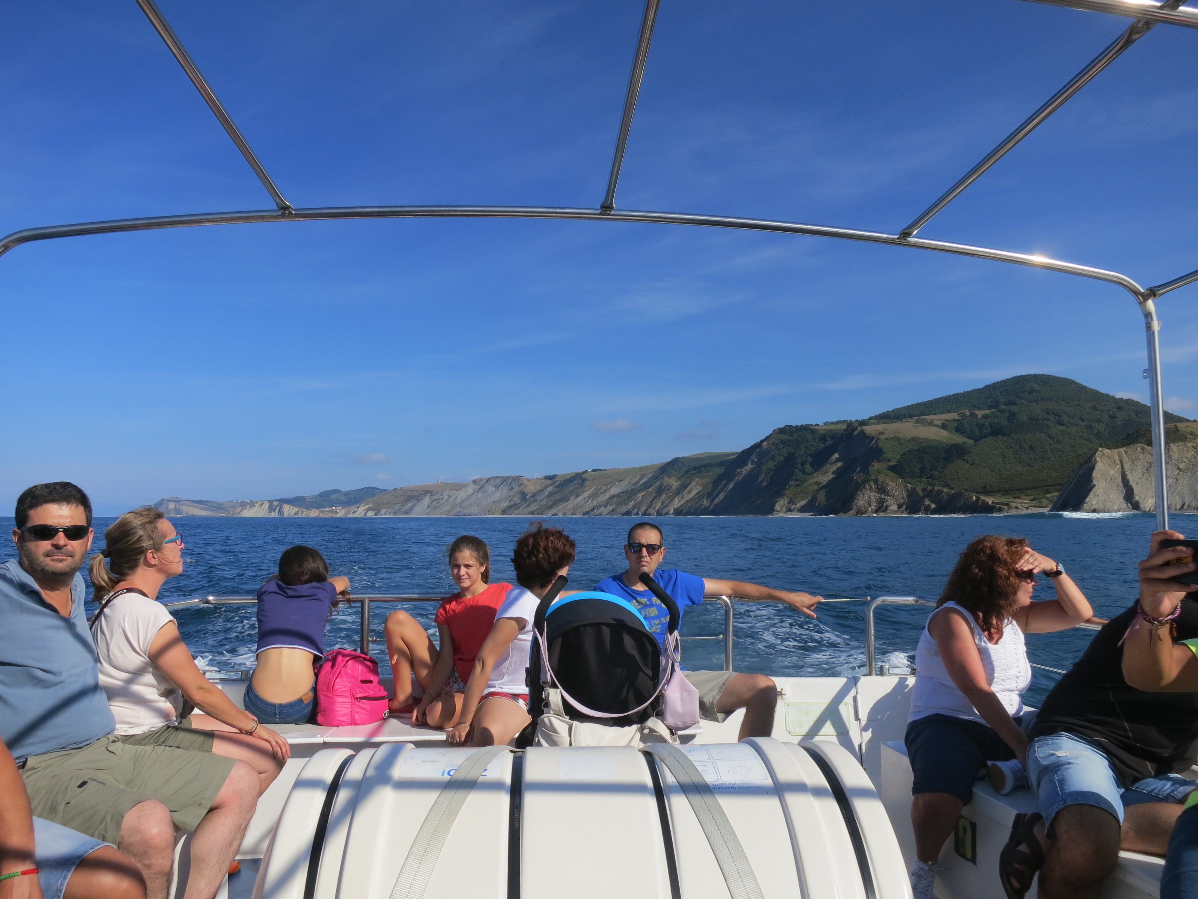Vi var omkring 30 ombord. En guide fortalte, at turen ud og hjem ville blive helt anderledes, og det fik hun ret i. På udturen talte hun om de traditionelle erhverv i kystens små byer. I Zumaia var den sidste fiskerbåd holdt op for mindst 20 år siden. Det forklarede, hvorfor byens restauranter til min skuffelse næsten ikke havde fisk på menuen, og den fisk jeg endelig fandt, mindede om en portion frossen fisk. Fiskeriet havde aldrig været stort i Zumaia. Byerne havde oprindeligt levet af hvalfangst, skibsbyggeri og mange havde arbejdet som søfolk.