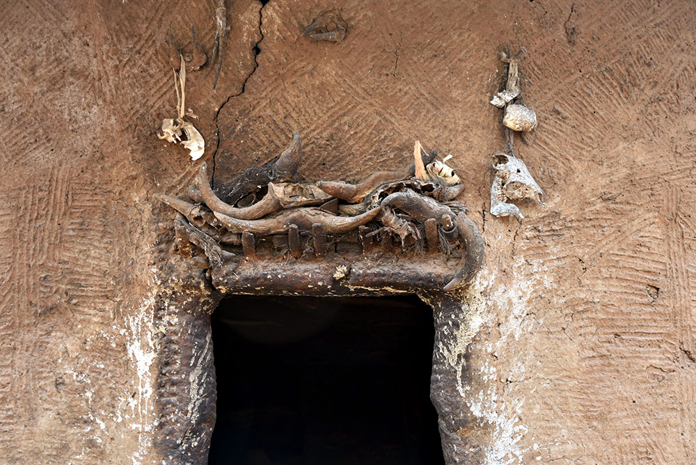 - Indgangen til et værelse. Bemærk fetisher, hvor der er ofret hirse for at beskytte familien