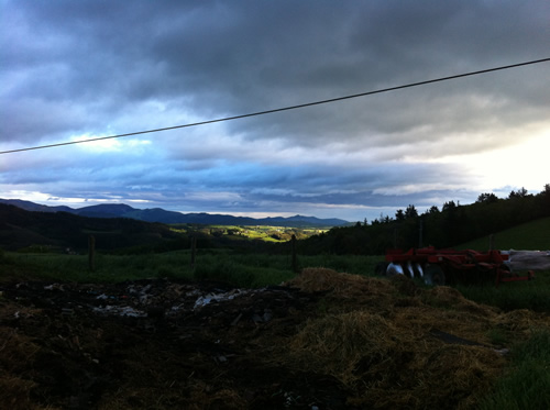 Gennem skyer og storm op over bjergene med flokke af gloende køer som tilskuere. Da dagens etape slutter i solskin, er stemningen blandt pilgrimmene munter og fjollet.