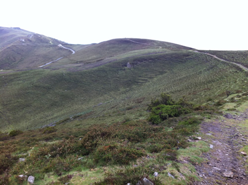 En lille slange krydser stien, måske på udkik efter haletudserne, som svømmer i de store vandpytter. I begyndelsen tænker jeg, at turen ikke er noget særligt. En grusvej fører en blidt op ad i bakkerne. En jernlåge leder en ind i selve området, hvor der går flokke af løse heste og køer. Da jeg er sidste ude af herberget, regner jeg ikke med at møde andre, så jeg skjuler mig ikke, da jeg skal tisse. Selvfølgelig passerer en ivrig vandrer mig netop da. Vi så ham i går og blev enige om, at han nok var en supervandrer, der gik mindst 50 kilometer om dagen. Han bevæger sig som en tegneseriefigur med superenergisk gang og vandrestokke, som danser hen af vejen. I dag præsenterer han sig som Jose. En ung mand fra Huelva i det sydlige Spanien. Undervejs venter han ofte på mig, da naturens rasen tager til, jo højere vi kommer op i bjergene. Snart går vi mellem drivende våde skyer. Jeg dækker min rygsæk med overtrækket.