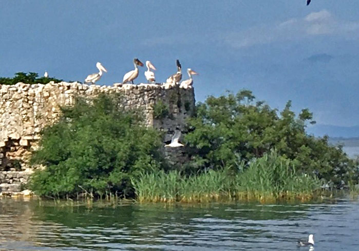 Senere på turen sejler vi på Balkans største sø Skadar i den sene eftermiddags disede lys. Som et kinesisk tuschmaleri udtoner et silhuet af bjergspidser sig rundt om søen. Og hvis udsigten ikke er nok, er søen et af Europas vigtigste områder for trækfugle i forår og efterår. Men en fugl bor her hele året, nemlig pelikanen. Tidligere boede pelikanen kun i den albanske del af søen, men nu har Montenegro lokket pelikanen til ved at etablere områder med redepladser til den enorme fugl. Hvis turistbådene ikke får skræmt pelikanerne væk igen, kan vi opleve dem ved ruinerne af en tidligere fængselsø.