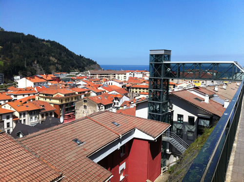 Mutriku ligger spektakulært klistret op ad en klippe. Husenes ene ydermur var meget høj, mens der var indgang flere etager oppe på husets modsatte side. Her var ingen strand, så børn og voksne badede fra havnens moler. Molerne var bygget, så de genererede energi fra bølgerne og gav strøm til nogle af byens huse, fortalte guiden os.