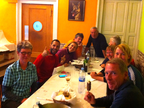 Nogle unge mænd forklarer mig, hvor jeg kan finde en butik og købe mad. Men højre, venstre giver ingen mening i en flække, hvor hvert stykke gade kun er på få meter. Gaderne er tomme bortset fra et ungt spansk par på ferie, som heller ikke kan finde butik eller restaurant. Til sidst går jeg op til den cafe, hvor jeg så de andre pilgrimme. De er på vej hjem, så jeg spiser alene. En smule stresset, da jeg ikke har lyst til at gå tilbage i mørke og risikere at fare vild igen med de mange små labyrintiske gader.