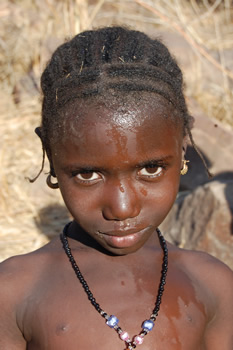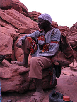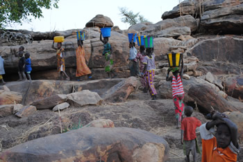 Vi samler den omfattende bagage. Monatou og Salimata skal hjælpe os. Det er lykkedes Lamenata at forklare sin onkel, at hun ikke er vant til at bære så tunge byrder på hovedet – og slet ikke at bevæge sig i klipperne. Jeg skal selvfølgelig ikke bære noget, og det skal hverken Ounde eller den tilbagekomne Amadou heller ikke. Altså skal al bagagen bæres af Salimata og Monatou, som endnu ikke er fuldt udvokset. Jeg insisterer på at tage min lille rygsæk, som trods alt er tung. Men resten af bagagen for mig, Lamenata, Amadou og Ounde af tøj, tekstiler, sæbe, kaffe, te, mælkepulver, sukker og suppeterninger til to uger hviler tungt på Monatous og Salimatas hoveder.